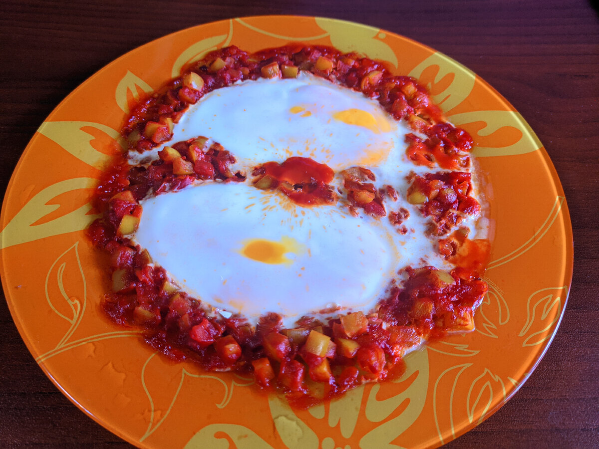 Сразу скажу, что это не классический вариант шакшуки. Но в качестве быстрого завтрака выбрала именно такой - готовится он быстрее и проще. Вам понадобится (на 1 порцию): Яйца - 2 шт. Помидоры - 0.5 шт. Перец болгарский - 1/3 или 1/2 шт. Лук репчатый (можно взять красный) - 1/4 некрупной луковицы Томатная паста - 1 ч.л. Оливковое масло для жарки - 1 ст.л. Специи - по вкусу Лук мелко нарезаем, 2-3 мин обжариваем на разогретом оливковом масле. Помидоры нарезаем небольшими кубиками, добавляем к луку, жарим на среднем огне 2-3 мин. Болгарский перец также нарезаем небольшими кубиками, добавляем к луку и помидорами, жарим на среднем огне 2-3 мин. Добавляем томатную пасту, доливаем немного воды, тушим 2-3 мин. Овощи снимаем с огня, выкладываем их на большую плоскую тарелку так, чтобы получились углубления для яиц. Разбиваем яйца, с овощами не перемешиваем. Ставим в микроволновку на 5 мин. Если яйца не схватились, ставим ещё на несколько минут. Подаём шакшуку горячей, можно посыпать зелёным л