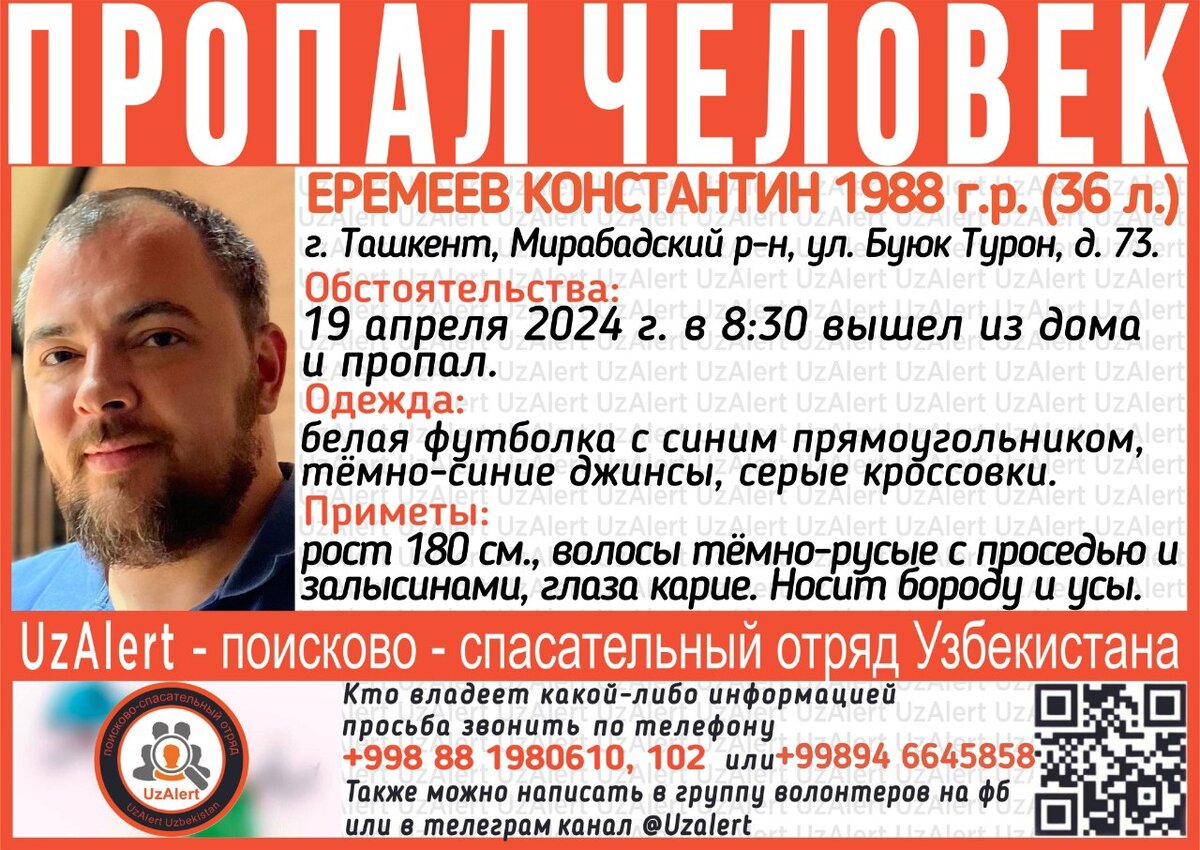 19 апреля бизнесмен, основатель сети кофеен «Варим кофе» Константин Еремеев вышел из дома и не вернулся. Константин проживал в Мирабадском районе Ташкента и вышел из подъезда в 08:30. Как уточняют родственники пропавшего, в тот день он направлялся в филиал своей кофейни по адресу: улица Бобура, 73Б.