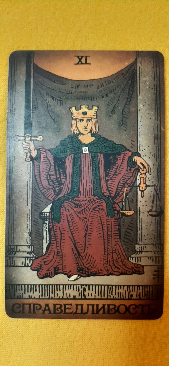 Одиннадцатый Старший Аркан – Справедливость – символ гармонии, правды и честного суда. Равновесие энергий и процессов в мире. Справедливость – добродетель, которая важна для общества. По этой карте идут государственные, бюрократические, бумажные дела и договоренности, установление законных прав. Карта холодного трезвого расчета, по ней проясняются ситуации, происходят сложные переговоры, выдвигаются требования. Гарантия желаемого результата.