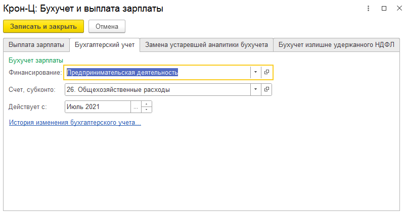 Изменение настроек бухучета без кадрового приказа можно выполнить при помощи документа Бухучет зарплаты сотрудников.