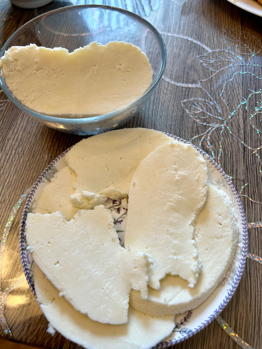 Вчера на меня напало тесто и молоко😀😀😀 в итоге весь вечер я пекла вкусняшки и делала сыр, он получился вкусный кстати) Очень нежный, сливочный, малосольный, а главное готовить его оказалось быстро и просто👩🍳 Домашний сыр: - 3 литра молока (я взяла Домик в деревне 3,5-4,2%); - 1 крупный лимон; - 1 литр горячей воды; - 3 чайных ложки соли; - марля. 1. Заливаем всё молоко в кастрюлю и доводим его почти до кипения, сильного кипения нам не надо; 2. Как только молоко начинает кипеть, вливаем сок целого лимона в кастрюлю с молоком, ждем, пока молоко свернется, когда сыворотка полностью отделилась, ее нужно слить, а получившийся творог откинуть на сито с марлей. 3. Пока творог стекает, в кипятке размешиваем соль, после чего промываем данным раствором творог. Сыворотку я вылила, хотя везде советуют сделать на ней оладья или намазать лицо. 4. Из промытого творога формируем кружочек, заматываем его с марлю, придумываем конструкцию с прессом над нашим будущим сыром и ставим в холодиль