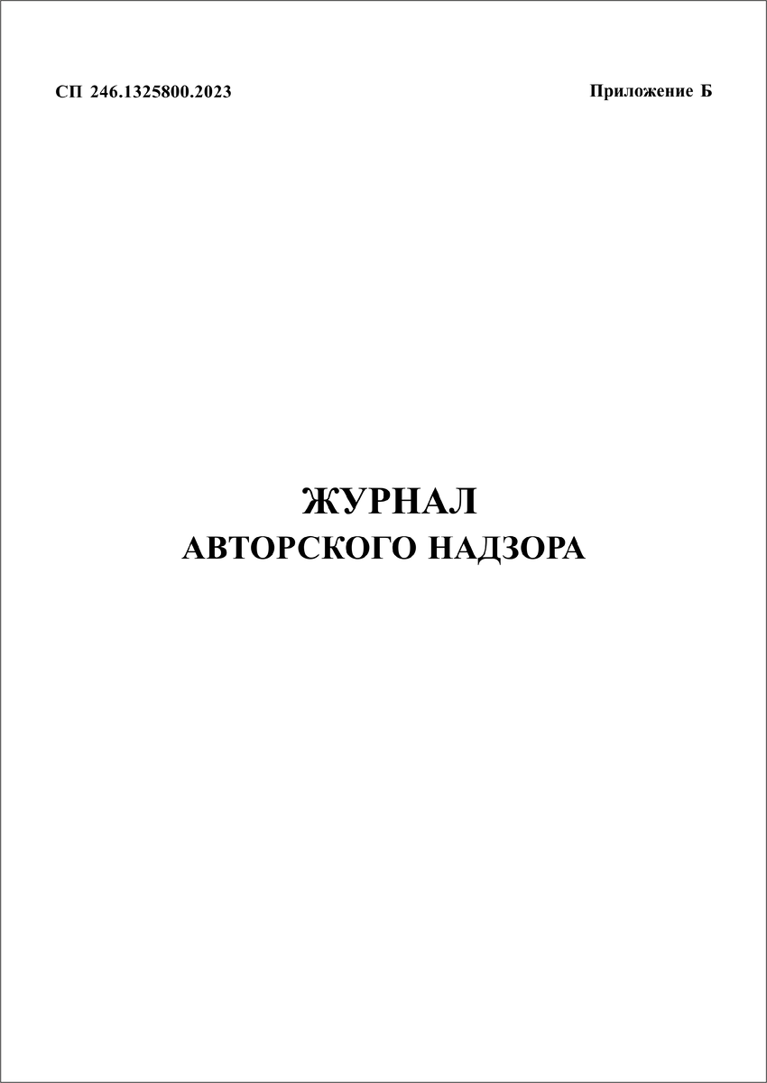 Нормативный документ: СП 246.1325800.2023 «Положение об авторском надзоре при строительстве, реконструкции и капитальном ремонте объектов капитального строительства». Титульный лист (поля для заполнения): (наименование, адрес) (наименование организации, Ф.И.О. индивидуального предпринимателя, адрес) (дата) (дата) М.П. (подпись) М.П. (подпись) Разделы журнала: Перечень подрядных организаций, осуществляющих строительные и монтажные работы 1. __________________________________________________________________________________ (наименование работ и организации) 2. __________________________________________________________________________________ Список работников лица, осуществляющего авторский надзор Наименование лица, осуществляющего авторский надзор Учетный лист № __________ Учетный лист № __________ Далее вид журнала: