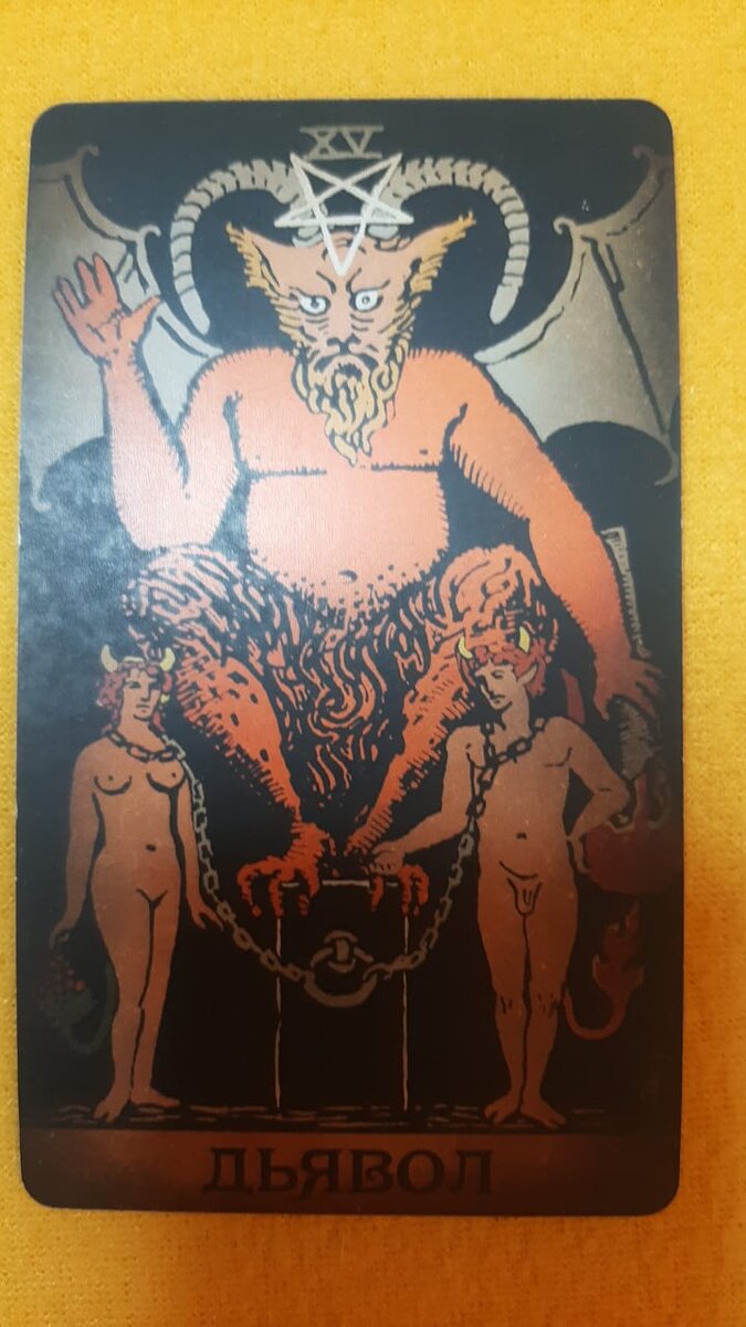 Прямая карта: Дьявол у каждого свой и может обозначать как плодородие и повышенную сексуальность, так и переход на сторону зла. В большинстве случаев это как раз столкновение с темной стороной жизни, человеческими пороками, обманом, похотью, грязными делами и опасными людьми. Желание властвовать, непомерная тяга к земным благам, ведь не зря Дьявола называют князем мира сего. Искушения, появление возможностей нечестным путем добиться желаемого или людей, сулящих золотые горы. Но за красивыми посулами скрывается подвох и за все придется дорого заплатить – игры с Дьяволом очень опасны. Он ловит нас на крючок страстей и желаний, под действием этого Аркана легко впасть в зависимость. Есть риски встать на скользкую дорожку, выбрать неверный путь, повязать себя круговой порукой, поэтому карта указывает на мафиозные структуры. Материальные интересы преобладают над духовными ценностями, совестью и моралью. Под действием Дьявола возможно все! А на невозможное потребуется больше денег, ведь все в этом мире продается и покупается.