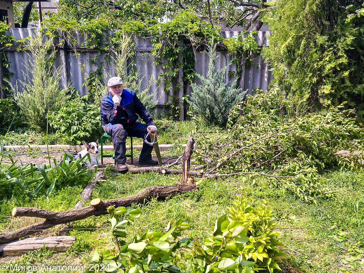 Ночью было весело. Ветер шумел, гудел и раскачивал деревья. Я проснулся от этих звуков, закрыл окна, а потом продолжил досматривать свои сны. А чего нам волноваться? Мы же спилили старый грецкий орех. Ну не совсем спилили, но достаточно укоротили ствол. Так что теперь можем спать спокойно и не тревожиться, что орех рухнет на крышу. Утром первым делом посмотрел на орех. Несколько веток мы ему оставили, и они покрылись листвой. Но, как видите, ствол почти голый и теперь ветра ему не страшны. Наша корги Тильда спешит сообщить мне, что с орехом всё в порядке, никаких разрушений не произошло. А мы идём дальше, чтобы увидеть, не случилось ли за ночь каких-то прочих неприятностей. Всё же ветер был ураганный, а мы к нему не готовились. Привыкли уже, что синоптики почти всегда ошибаются в прогнозах, вот и проигнорировали штормовое предупреждение. А может быть, его и вовсе не было. Лена замечает несколько сломанных побегов на нашей великолепной розе Сахара. Очень жаль, это одна из наших самых л