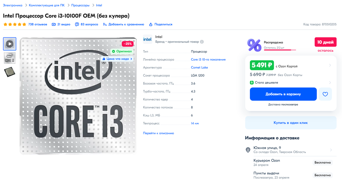 Здравствуй, дорогой читатель. Вот и пришло время мне написать статью о том, каким должен был быть комп за 45, если бы не моё желание лично опробовать Ryzen 5 5600G. В этой статье будет оптимальная сборка за 45к, подобранная по тому же принципу - часть комплектующих из Озон, часть из Онлайнтрейд и часть из ДНС.. * все цены актуальны на 21.04.2024. Что же, начнём. Процессор берём Intel Core i3 10100F С процессором всё понятно - бюджетный камень для бюджетной сборки. Ценник на Озон радует. Под наш процессор берём сразу кулер ID-Cooling SE-903-SD V3 У процессора максимальное тепловыделение 90 Ватт, так что кулер с небольшим запасом для тихой работы. Ценник на кулёк в ОТ весьма гуманный - лучше, чем на Озон. Далее выбираем материнскую плату для нашего камушка и это будет MSI H510M-A Pro Просто самая бюджетная доска под нашу платформу. Поддерживает XMP, сможет отдать 90Ватт для процессора и слот m2 под SSD в наличии - больше от неё и не требуется. Оперативной памяти, конечно, оптимально бр