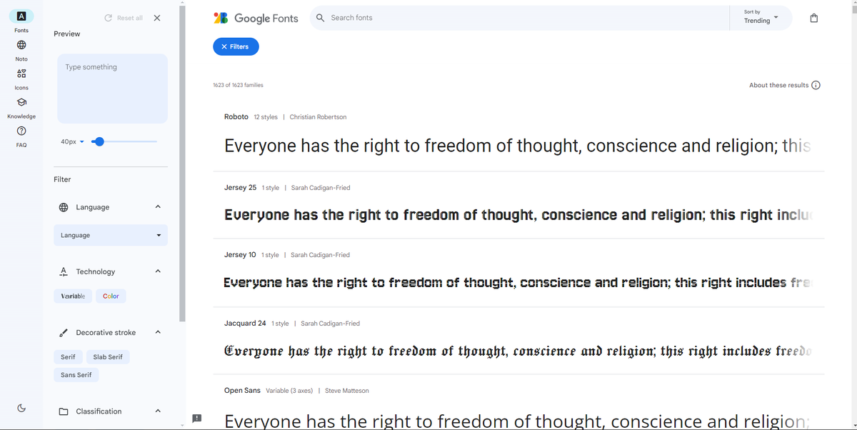 Этот инструмент весьма полезен для поиска подходящего нам шрифта. К примеру, мы хотим найти шрифт Roboto. Для этого достаточно найти его в уже выданном столбце, либо ввести в поиске название. После того, как нужный шрифт был найден, необходимо экспортировать его в наш проект. Это можно сделать двумя способами:
