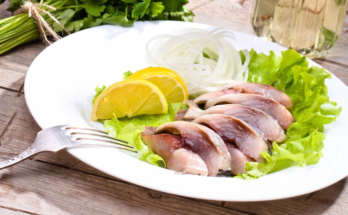 Приготовленную по этому рецепту малосольную сельдь можно будет есть уже через час. Секрет — в правильном маринаде. Он должен получиться достаточно крепким, травы добавляются для непередаваемого аромата.