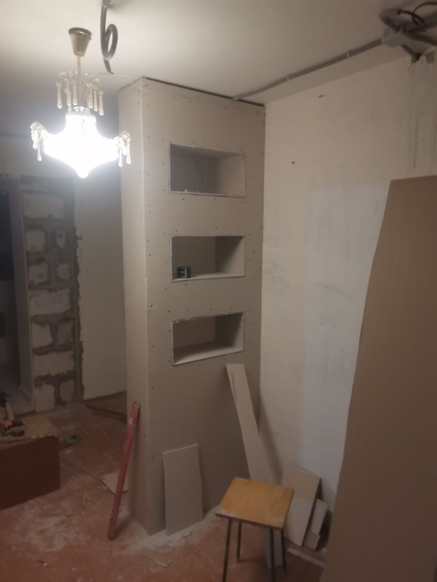 Вот мы плавно перешли и к отделке/ переделке девичьей комнаты,площадью 16 кв. м. Так как девочки у нас будут делить одну комнату на двоих, решено было создать каждой свой уголок. Каким образом? Я против любых пылесборников, плюс младшая аллергик, но во-первых, это прикольно, во-вторых, придётся просто чаще стирать. Начало тут Пример перегородки между кроватями взяли из интернета. Замеры делали, исходя из длины и ширины кроватей, плюс отступы в 5 см - это учёт плинтусов. Перегородку решено было делать в потолок и со сквозными полками. Основа- металлический профиль, обшивка- гипсокартон. Цвет для её покраски выбрали нежно лиловый, в реальности нанесено будет 2 слоя. Следующий этап- уменьшение дверного проёма в счёт увеличения стены. Решили, что в квартире будут двери купе вместо распашных. Это и функциональнее ( экономит пространство), и локаничнее для общего восприятия. Никогда не нравились распашные двери. Эти внезапные столкновения ( благо не всегда со лбом))), торчащие ручки