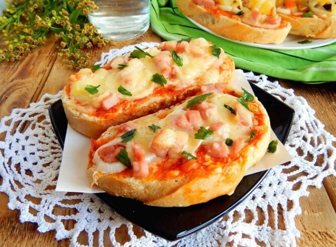 Простая, вкусная и быстрая - для перекуса или в дорогу! Мини пицца на батоне в духовке получается без лишних хлопот и временных затрат. Не нужно возиться с тестом, а начинка может абсолютно любой. НА 5 ПОРЦИЙ НУЖНО: Батон (300г) - 1гр Вареная колбаса- 200гр Твердый сыр- 100гр Лук репчатый- 1 шт Майонез- 2 стол.л Кетчуп-- 2 стол.л Шаг 1:Батон можно использовать любой: широкий, узкий, багет, чем уже будет батон, тем меньше получатся по размеру пиццы. Приготовленные кусочки батона выкладываем на застеленный пергаментом противень. Шаг 2:В качестве намазки на основу пиццы лучше использовать кетчуп, его можно заменить томатной пастой по желанию, и майонез. Перемешиваем их в миске до получения однородной по консистенции смеси. По вкусу можно добавить соли и черного молотого перца, но как правило, все составляющие пиццы содержат достаточно этих специй Шаг 3:Репчатый лук очищаем от шелухи и нарезаем тонкими кольцами Шаг 4:Колбасу можно использовать любую: вареную, копченую или ветчину. Нарезаем