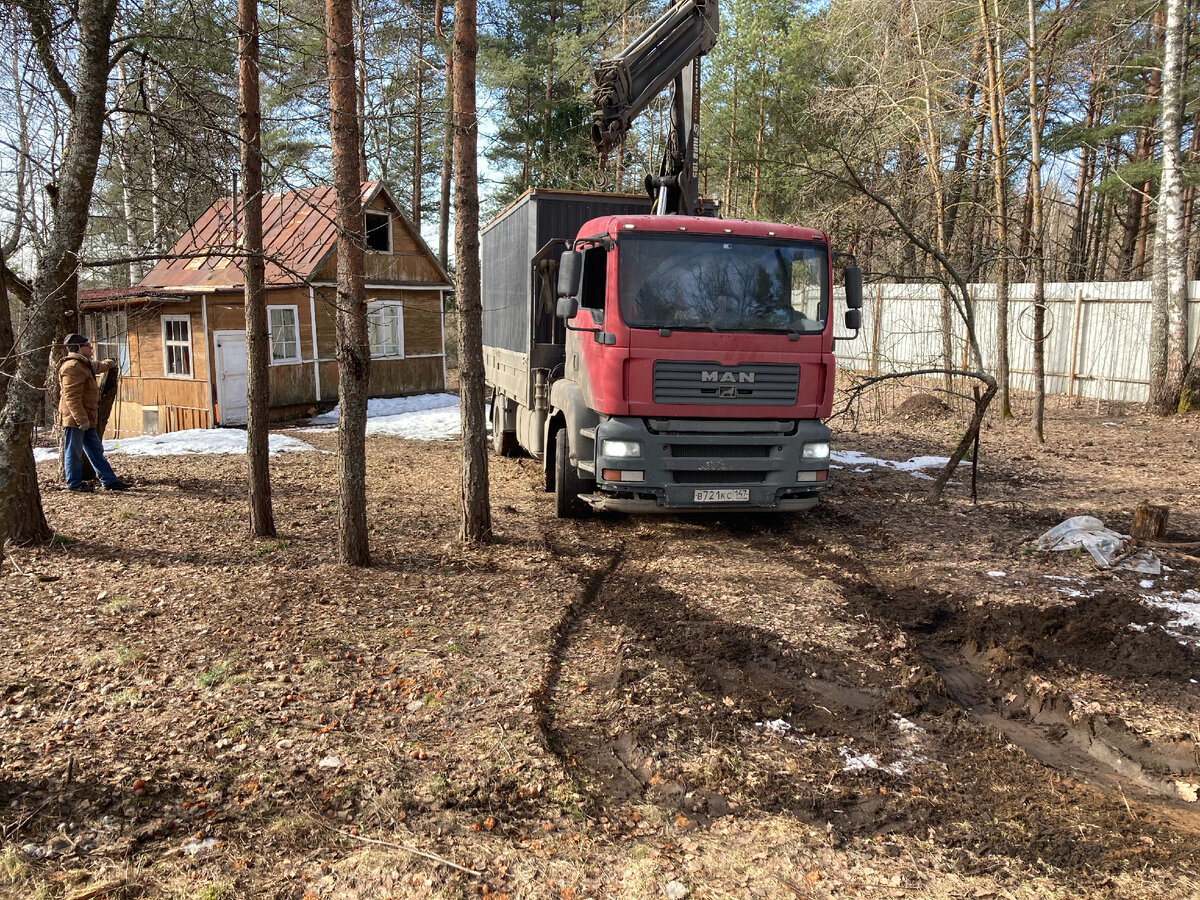 Заранее привезли арендованную бытовку и перегрузили в нее все инструменты и мелочи. Перетащили туда диван, кухню и стол. После того как на выезде с участка застрял огромный MAN стали сразу очевидны проблемы весенней стройки. Кстати, стоит не забыть проконсультироваться с председателем СНТ о возможном закрытии дорог в садоводстве. Обычно, они закрыты на весь апрель, но не в нашем случае! и дороги не закрыты и альтернативный подъезд имеется по которому вывозили весь мусор. Дом снесли за 15 минут. Все остальное время в течении дня грузили и вывозили, ровняли и перераспределяли грунт на участке выравнивая пятно застройки. Вот, посмотрите как это было: После вывоза тракторист остался и подровнял площадку под будущее строительство В итоге первого дня работ все стало выглядеть вот так: Стоимость сноса садового дома с фундаментом, уборкой и ровнением участка: 80 тыс.руб. + потребовалось 3 пухто по 25 тыс.руб. для вывоза мусора и один самосвал для вывоза тяжелых элементов фундамента за 15 ты