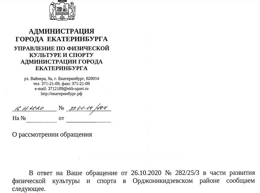 Ответ из Министерства физической культуры и спорта Свердловской области: