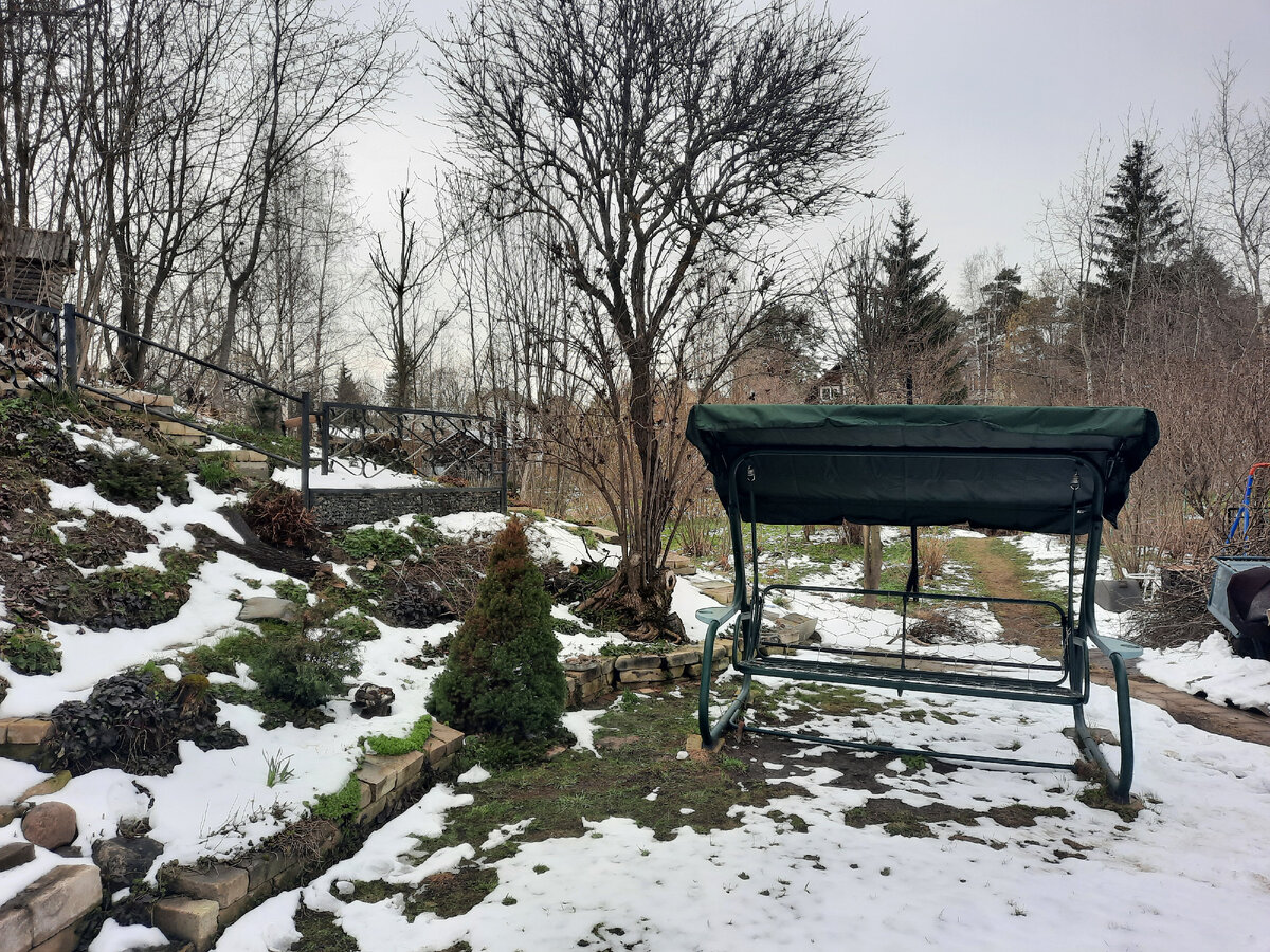 Начнем с весенней весточки, с качели! Мы вернули ее на место, сидушку. А еще я нашла нынче крышу по размеру, наша то совсем истрепалась, и замена тоже. Муж пристроил на место. Два года искала, не было. Посидеть пока не получилось, но все же летом пахнуло!