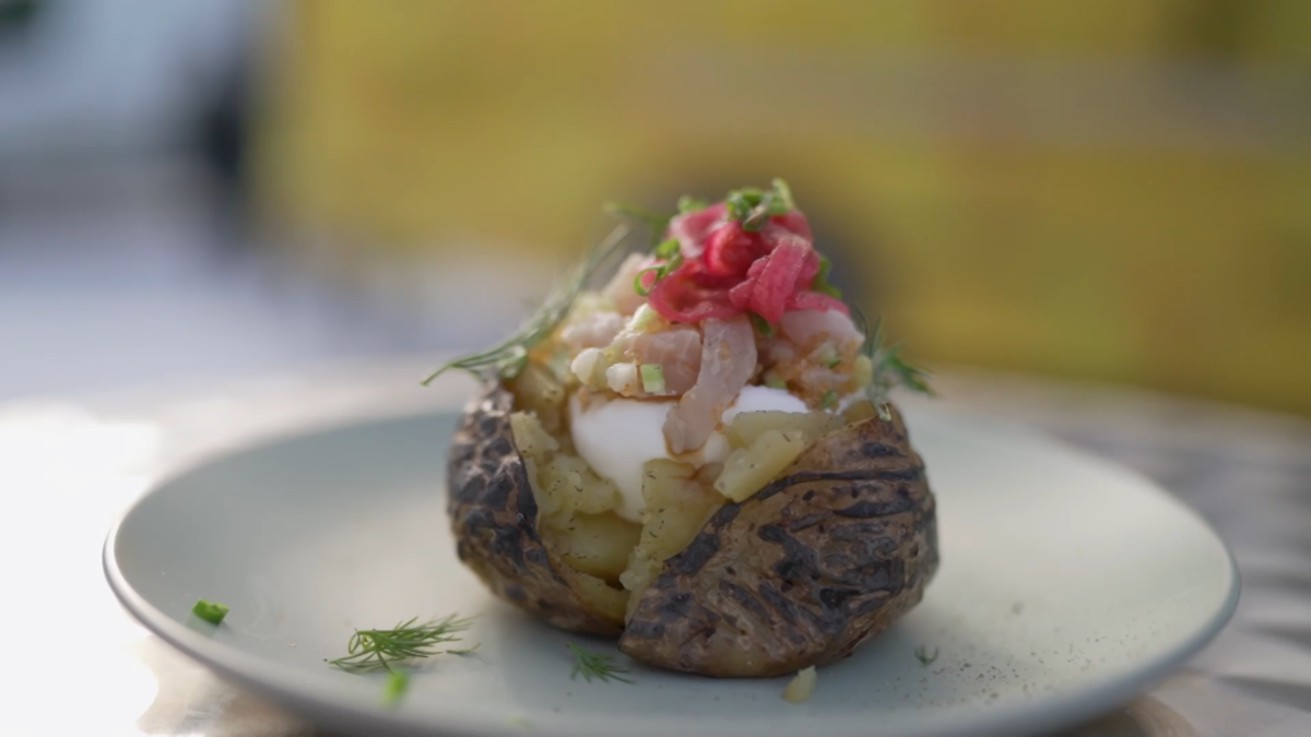 1. Разрежьте картофель пополам и добавьте внутрь домашнюю сметану.