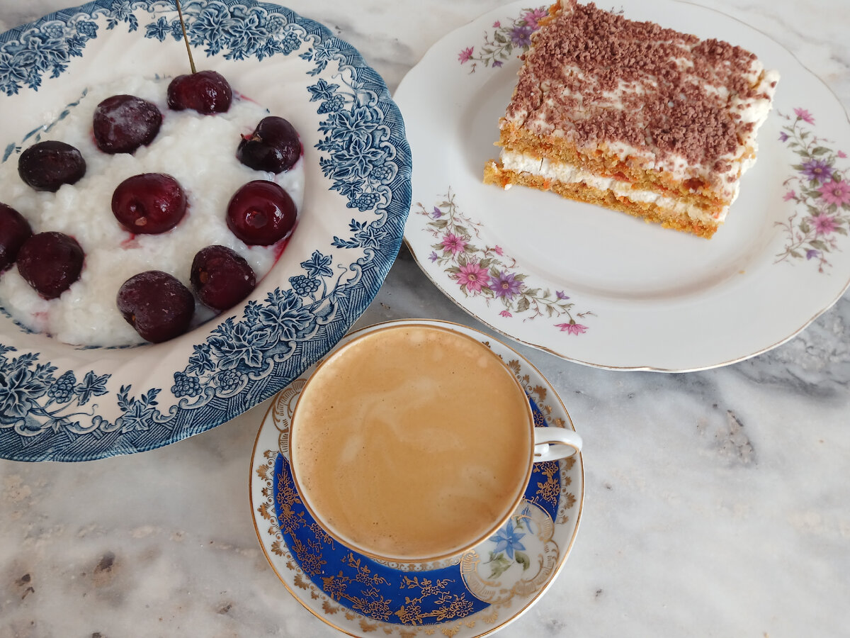 О моих запасах продуктов и бюджете на питание в апреле можно почитать ЗДЕСЬ Покупка продуктов №1 - Ашан, Перекресток, Я-Маркет, молочная ферма, Лентa, Чижик, Дикси, Светофор, Вкусвилл Покупка продуктов №2 - Лентa, Пятерочка, Дикси Покупка продуктов №3 - Вкусвилл, Яндекс-Маркет, Пятерочка, Дикси Каталог рецептов Сегодня отдыхаю от кухни. Вчера наготовила много, так что на сегодня есть в холодильнике и торт к кофе, и обед, и ужин. 👍 Только сварила к завтраку рисовую кашу. Ели ее с черешней. Это уже последней пакет из морозилки. Очень вкусно - черешня с рисовой кашей! Черешня сладкая очень. Обязательно буду в этом году снова замораживать. Прям находка зимой. 👍 И, как обычно, чашечка эспрессо и приличный кусман морковного торта. Торт весь не съела, оставила половину на кофейный перекус Про чашечку спрашивали: это винтажная Германия, 1970-е г. примерно Покупала ее в интернете. Чашка в идеальном состоянии, вся позолота на месте очень маленькая, изящная. Просто королевское удовольствие из н