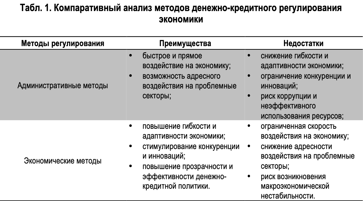 Наибольшей эффективности денежно-кредитное регулирование экономики достигает в процессе использования как прямых, так и косвенных рычагов одновременно (см. табл. 1).