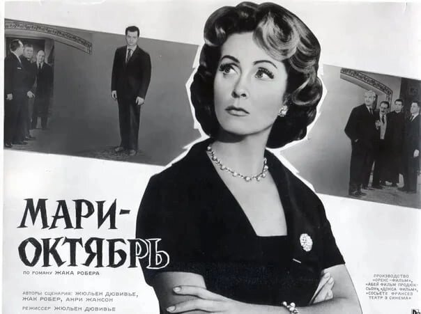 В наши тёмные времена с интересом смотрятся фильмы, казалось бы, представляющие только исторический интерес. К их числу относится и французский фильм 1959 года «Мари-Октябрь». Впрочем, есть обстоятельство вне времени. Здесь можно насладиться прекрасной игрой актёров, известных по другим фильмам: Даниэль Дарьё, Поль Мёрис, Бернар Блие, Лино Вентура, Робер Дальбан, Поль Франкёр. И, конечно, актёр и шансонье Серж Реджани. Какие интересные характеры! Как закручена интрига! Афиша фильма «Мари-Октябрь». 1959. Хотя действие в фильме происходит в 1959 году, спустя 15 лет после окончания Второй мировой, роман Жака Робера «Marie-Octobre», по которому был снят фильм, увидел свет в 1948-м.