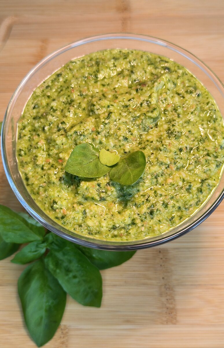 Ингредиенты: ◽ Зелёный базилик - 70 г.; ◽ Оливковое масло - 60 г.; ◽ Тёртый пармезан - 50 г.; ◽ Обжаренный кешью - 50 г.; ◽ Соль, сухой чеснок по вкусу; ◽ Вода по необходимости. Приготовление: Нам понадобится свежий зелёный базилик. Если базилик молодой, можно также использовать стебли. Все ингредиенты поместить в блендер и смешать до однородности. Соус получается достаточно густой и с очень насыщенным вкусом. Я добавила немного воды, чтобы консистенция соуса и вкус стали более мягкими. Этот соус подойдёт к рыбе, к овощным блюдам. Получается очень вкусно, рекомендую ☺️ 👩🏼🎓 Зелёный базилик содержит эфирное масло, которое обладает антибактериальными свойствами, благодаря чему зеленый базилик является отличным средством для борьбы с болезнями и воспалительными процессами в организме. Зелёный базилик содержит много полезных веществ, таких как витамин А, С, К, В6, железо, кальций, калий и магний. 🔴 Базилик вреден в больших количествах (допустимая норма для взрослого человека в