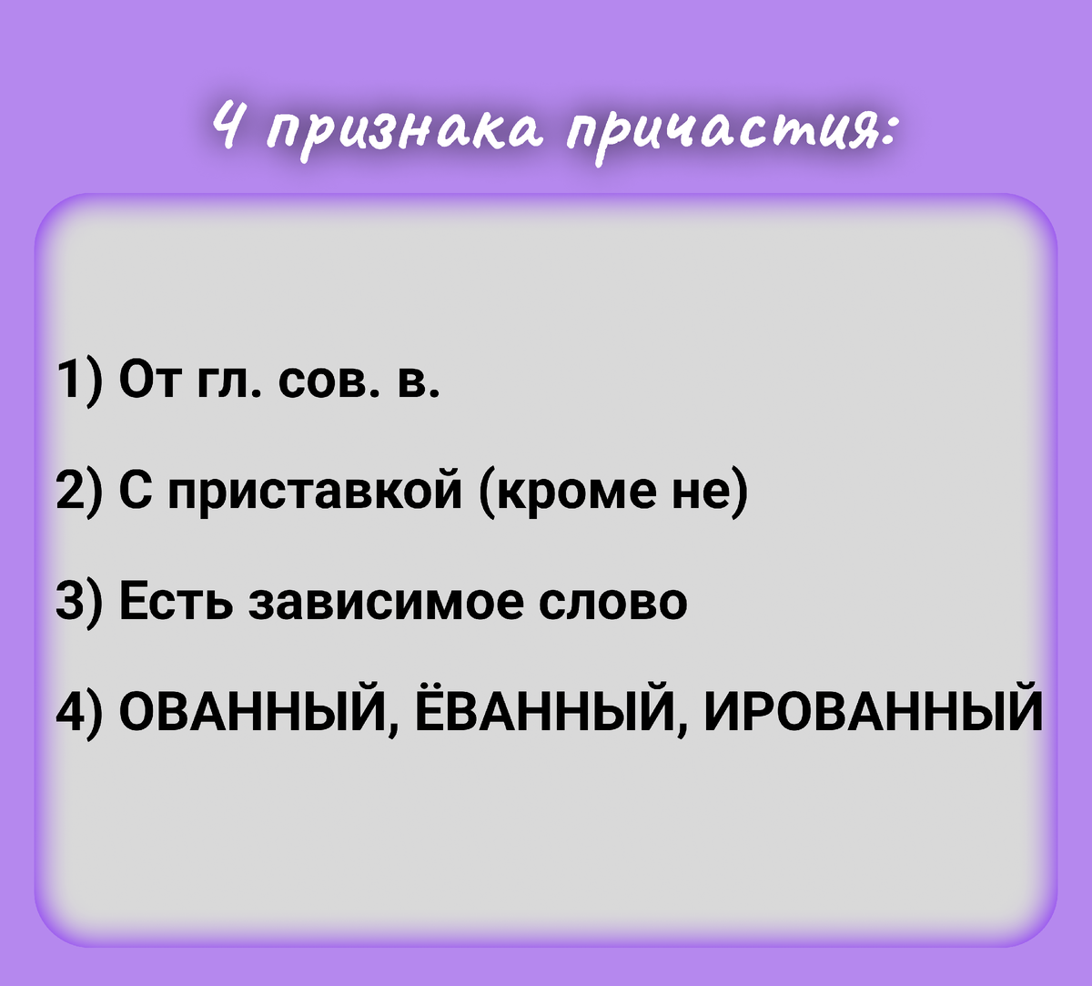 Причастия и отглагольные прилагательные В полных причастиях пишем -НН, а в отглагольных прилагательных – -Н Как отличить причастие от отглагольного прилагательного? Для этого надо знать 4 признака: 1) Если слово образовано от глагола совершенного вида, то перед нами причастие. А причастие в полной форме пишется с двумя буквами -НН Оставленные – от гл. оставить (что сделать? Сов.в.) Заброшенный – от гл. забросить (что сделать? сов.в.) Если слово образовано от глагола несовершенного вида, то перед нами отглагольное прилагательное. А отглагольное прилагательное пишется с одной буквой -Н Варёный – от гл. варить (что делать? несов.в.) Жареный – от гл. жарить (что делать? несов.в.) 2) Если слово с приставкой (кроме НЕ), то перед нами причастие Скошенный – приставка -С Выкрашенный – приставка -ВЫ *Но есть бесприставочные причастия, образованные от глаголов совершенного вида: Брошенный – от гл. бросить (что сделать? сов.в.) Лишённый – от гл. лишить (что сделать? сов.в.) Казнённый – от гл. ка