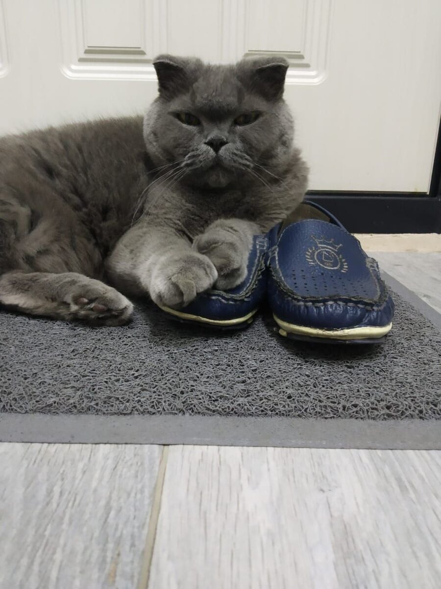 В доме вместе с нашим выпускником живёт ещё кошечка, которая досталась хозяйке в наследство от её мамы. "Малыш стойко, как настоящий Леопольд терпит её хулиганства, но иногда не выдерживает и начинает гонять Муру по квартире. Очень редко, но как котенок играет с мячиками и другими игрушками. Любит спать на высоком стуле и смотреть на всех оттуда".