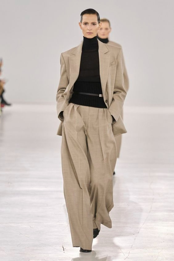 Самый модный вариант, классическая история бренда Max Mara - сочетать широкие брюки с защипами классический жакет, добавляем черную водолазку или футболку. Ну и обратите внимание, как хитро дизайнеры вписывают модный аксессуар пояс в этот комплект. Завяжите его поверх водолазки. И, конечно же, лучше всего этот комплект смотрится с собранными волосами.