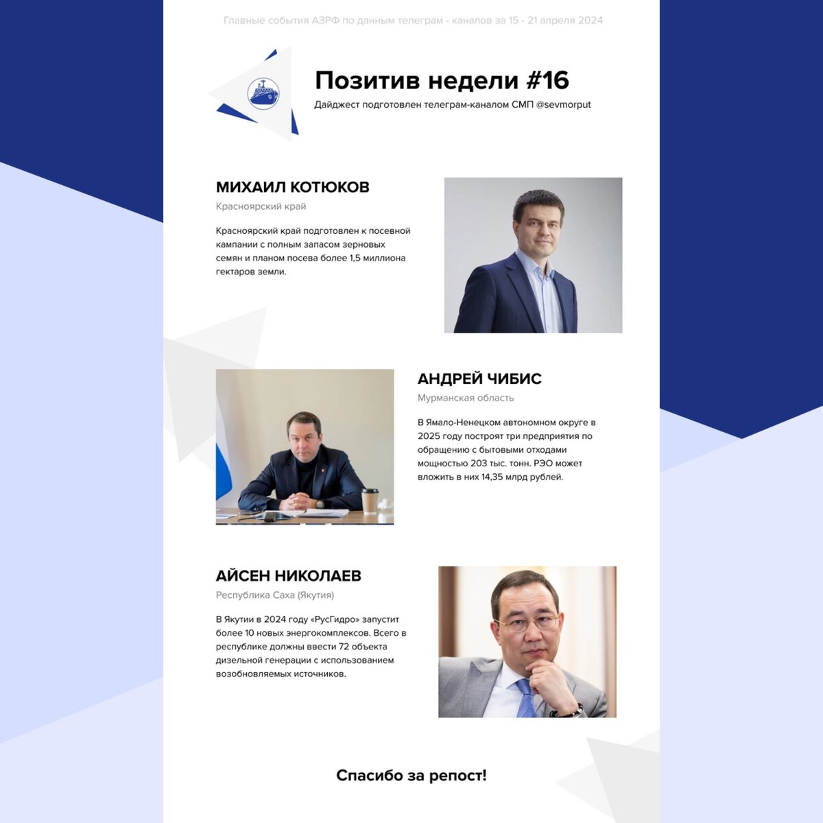 Представляем еженедельный рейтинг «Главы АЗРФ — Позитив недели. Неделя 16» Михаил Котюков Красноярский край полностью подготовился к посевной кампании, обеспечив себя зерновыми семенами на 100%, удобрениями на 81,7% и техникой на 91%. В этом году сельхозпроизводители планируют засеять более 1,5 миллиона гектаров, увеличив площади под такие культуры как рапс, горох и сою. Массовый выход в поля запланирован на первую декаду мая, с обеспечением всех необходимых материально-технических ресурсов. Работы уже начались в нескольких районах, где аграрии активно увлажняют почву и вносят удобрения. Андрей Чибис Губернатор Мурманской области Андрей Чибис во время встречи с президентом России Владимиром Путиным представил отчет о выполнении нацпроектов и заявил о своем намерении продолжить работу в качестве главы региона, открыв второй пятилетний срок своего руководства субъектом. Чибис рассказал о достигнутых показателях миграционного прироста в регионе, снижении темпов убыли населения, росте вн