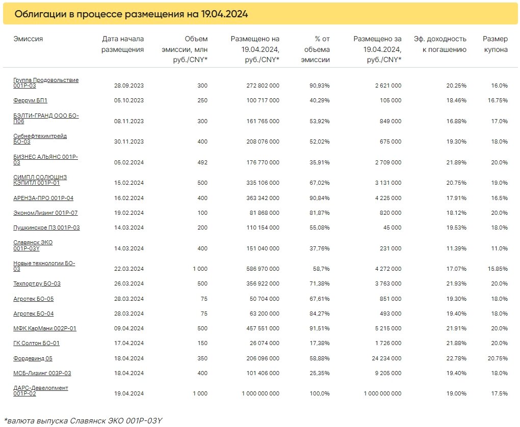 Коротко о торгах на первичном рынке 19 апреля стартовало размещение двухлетних облигаций ДАРС-Девелопмент 001Р-02 объемом 1 млрд рублей. Выпуск был полностью размещен в первый день торгов за 1 949 сделок, средняя заявка 513, 08 тыс. рублей Коротко о торгах на вторичном рынке Суммарный объем торгов в основном режиме по 420 выпускам составил 1068,5 млн рублей, средневзвешенная доходность — 16,3%. 📊 Подробнее в ВДОграфе Больше актуальных новостей читайте оперативно в нашем телеграм-канале