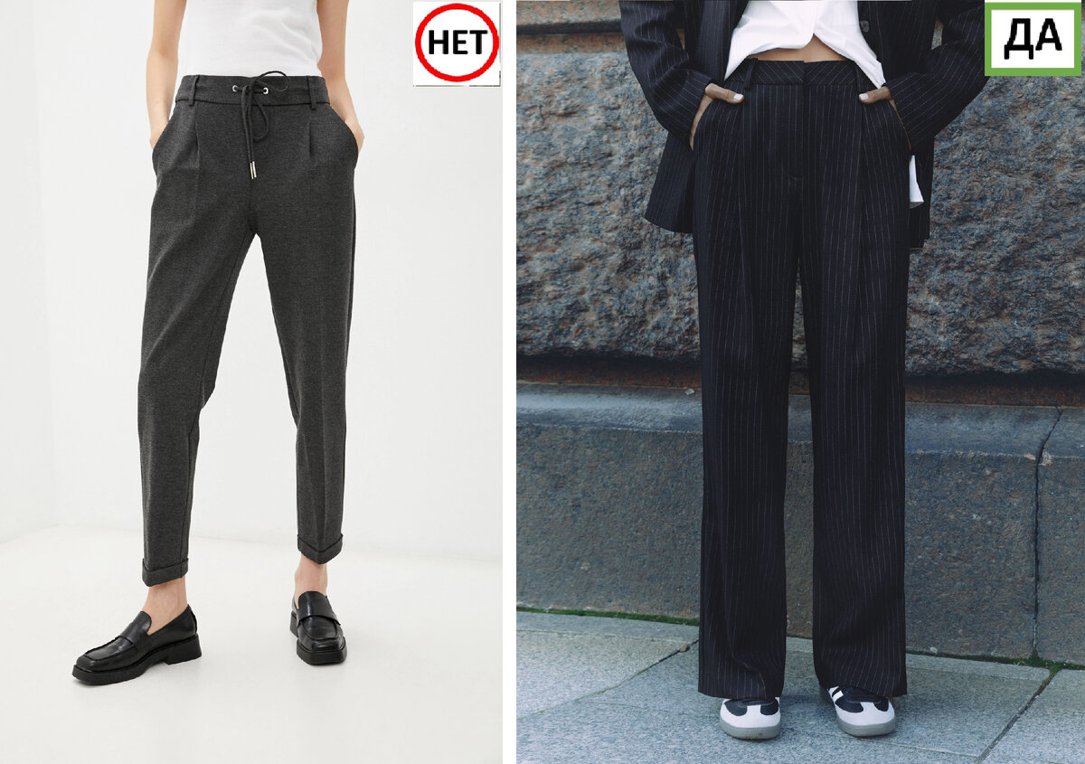 Трудно найти что-то лучшее для гардероба, чем прямые брюки. Важно, чтобы они были из хорошей, плотной костюмной ткани и с правильно оформленных верхом (шлевки, застежка). Вроде бы, ничего сложного в этой формуле успеха нет, но я часто вижу, что выбирают нечто, похожее на левый вариант: с подворотами, невнятной ширины и длины, со шнурками в поясе и т.д. Но это все не нужно, оно создает визуальный шум и выдает, что вещь не первой свежести. Слева брюки стоят 6599 руб, справа - 5499.