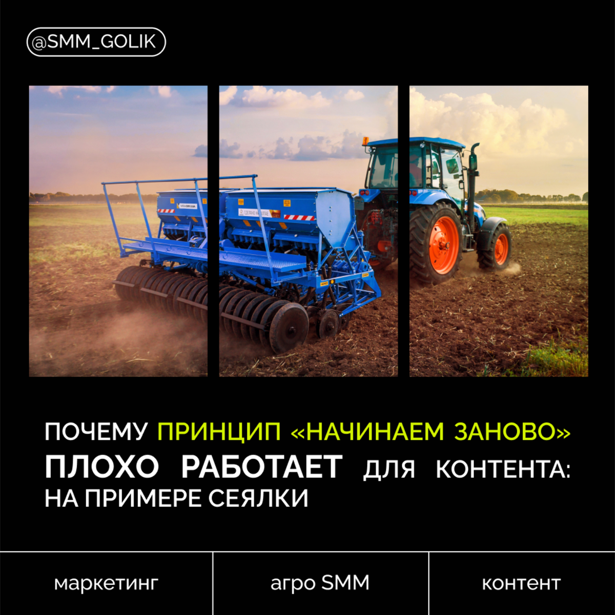 Мы все такое или слышали, или сами думали: «С понедельника начинаю новую жизнь», начинаем с чистого листа, меняем старое на новое и т. п. Мы думали, признаёмся ☺️ Но давайте разберемся, почему этот подход не годится для контент-стратегии от слова совсем. Допустим, вы маркетолог компании, которая производит сеялки. В прошлом году вы писали про … сеялки (ну а о чем вам еще писать?!). Про их характеристики и преимущества, сняли видео на поле, на выставке или обучении дилеров. Кажется, что еще можно рассказать о сеялках? Увы – новую сеялку нам никто не создаст. Да, новинки бывают, но чаще всего маркетологам компании нужно рассказывать о продуктах, которые не меняются из года в год. Как сделать так, чтобы не надоесть подписчикам? Во-первых: если нельзя разнообразить продукты – надо разнообразить форматы. Есть 2-3 видео с поля с прошлого года, и они уже опубликованы? Их можно: 1️⃣ перемонтировать и добавить аудио от специалиста с комментариями 2️⃣ смонтировать с мемом и подать видео сеялки ч