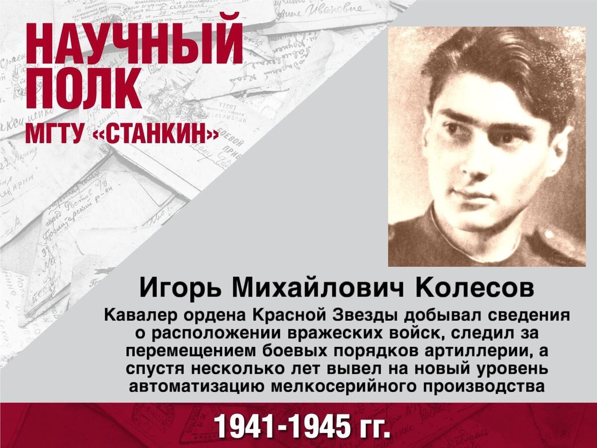 Сегодня исполняется 102 года со дня рождения Игоря Михайловича Колесова, который был учеником и последователем научной школы Бориса Сергеевича Балакшина, разработчика фундаментальных положений в области теории размерных цепей и теоретических основ базирования, оказавших влияние на международную практику. Игорь Михайлович пришёл в СТАНКИН только в 1947 году, а несколько лет своей жизнь он отдал военному делу. В 1942 году Колесов окончил командные курсы и получил звание младшего лейтенанта. Он воевал на Брянском фронте, а 3 июня 1943 года получил ранение. Лечение заняло несколько месяцев, из госпиталя его выписали только в октябре, оттуда он был направлен на Калининский фронт. В 1944 году Колесов прибыл в штаб 1-го Прибалтийского фронта, участвовал во взятии Кенигсберга, затем был переведён на 2-й Белорусский фронт. «Лейтенант Колесов, работая в должности адъютанта зам. Командующего артиллерией 1 Прибалтийского фронта, а затем адъютантом Командующего артиллерией 65 армий во всех проведен
