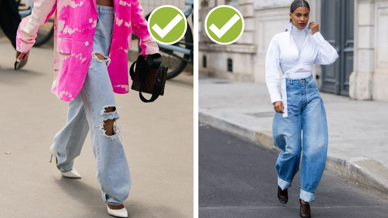 К широким джинсам лучше подобрать верх по фигуре, чтобы фигура не выглядела бесформенной