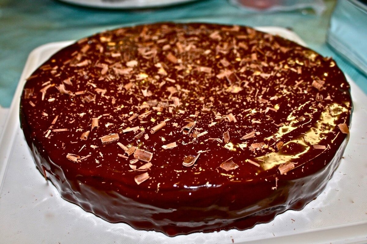 - Для приготовления глазури в небольшом сотейнике соедините молоко, сливочное масло, какао-порошок, сахарный песок, и помешивая, доведите до кипения, снимите с огня и немного остудите. Полученной массой залейте пирог, дайте немного застыть глазури и украсьте по своему вкусу. По желанию можно нанести на пирог растопленный шоколад (темный или белый) или просто посыпать сахарной пудрой.
