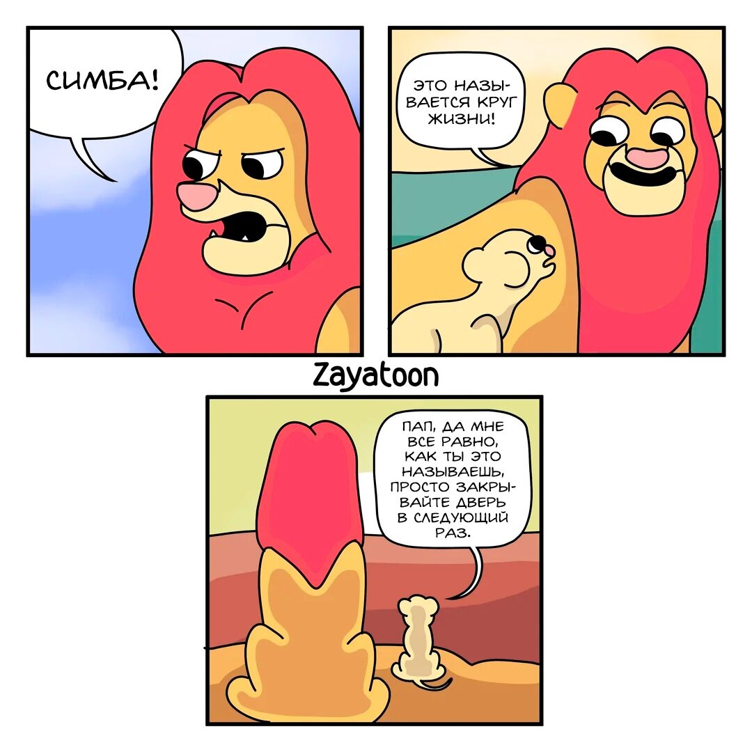 Один из часто используемых приемов в юморе - это когда совмещают что-то несовместимое, тем самым добиваясь эффекта абсурдности. Отличный тому пример - превращение изначально детских сюжетов во что-то взрослое. Тем самым может достигаться эффект неожиданности - мало кто может предугадать, что персонажи «Короля Льва» или «Рататуя» начнут обсуждать взрослые темы, а сюжет «Истории игрушек» закончиться чем-то очень мрачным. В общем, сегодня я как раз собрал для вас примеры таких комиксов. Надеюсь, что они вам понравятся! Канадский художник Исайя Фолкнер (Iziah Faulkner), также известный под псевдонимом Zayatoon, в своих работах часто использует персонажей известных фильмов и видеоигр. К примеру, одну из своих зарисовок этот автор посвятил разговору Муфасы и Симбы, а также тому самому кругу жизни, который упоминается в мультфильме «Короля Льва». Канадская художница Эллен Вудбери (Ellen Woodbury) является автором серии комиксов Pizza Cake Comics («Пицца-торт»). Большинство выпусков данного пр