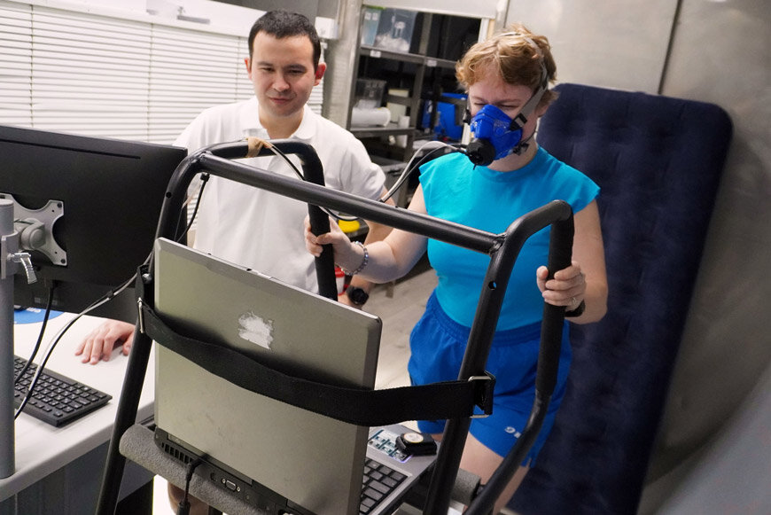 Требуется преодоление себя, если есть желание повысить свой результат. Если человек не справляется, он может об этом сообщить, попросить постановщиков сделать протокол более лёгким. А может и просто не выкручивать то, что написано на экране, если не позволяют силы. Всё зависит от самого испытателя: нет тренера, который постоянно стоит над душой и подгоняет. Да и мы не стремимся в олимпийский резерв. Каждый испытатель проводит тренировку самостоятельно, под свою ответственность. Помощь ассистента требуется только в начале, чтобы запустить аппаратуру, а далее – никто не смотрит, установка Cosmed не записывает твои показатели, только пульсовой датчик. Полностью данные записываются во время тестов и на пассивной дорожке. А здесь ты предоставлен сам себе и только ты решаешь, чего хочешь в этот момент.