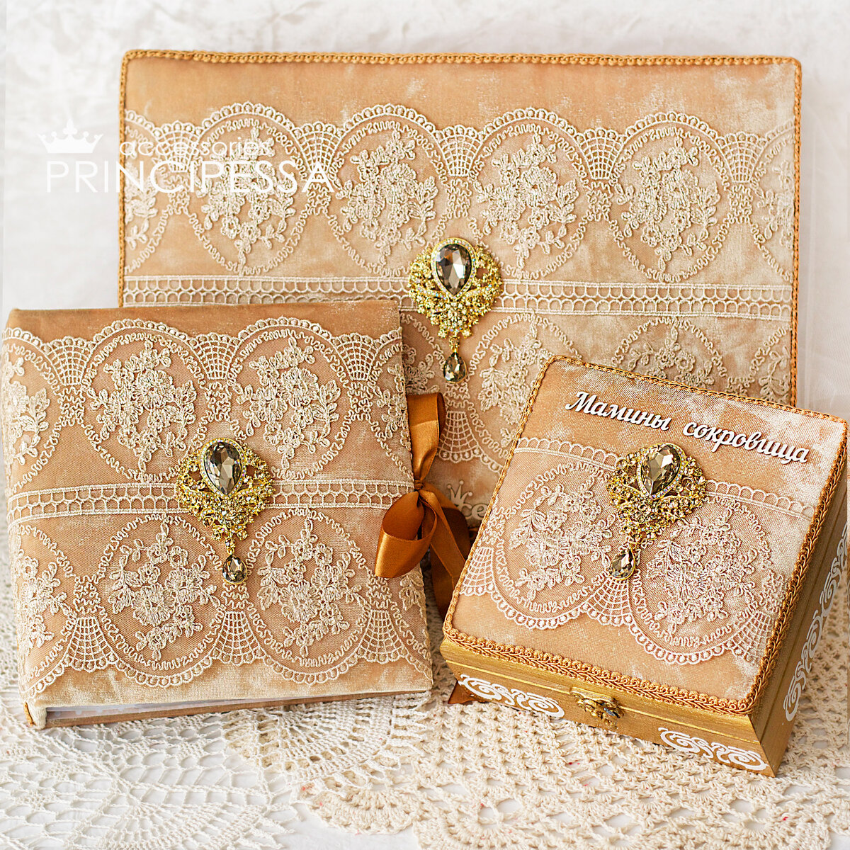 В набор входило: -фотоальбом -шкатулка мамины сокровища -большая подарочная коробка Такой набор можно подарить на рождение ребёнка, на крестины Все предметы украшены бархатом и кружевом Фотоальбом мягкая обложка из бархата и кружева Фотоальбом 22х22см на 200 фото формата 10х15 Шкатулка деревянная 18х18см окрашена золотой краской Крышка мягкая, бархатная с кружевом Внутри 4 отдела с надписями для хранения вещиц ребенка Коробка большая также бархатная, все предметы украшены большими брошками с кристаллами Нет в наличии / без повтора ______________________________ Мои другие источники, где я делюсь своим творчеством: Instagram: https://www.instagram.com/solis.iness Ярмарка мастеров: https://www.livemaster.ru/principessa-si Вконтакте: https://vk.com/solis_iness Telegram: https://t.me/solis_iness Pinterest: https://ru.pinterest.com/solis_iness Boosty.to: https://boosty.to/solis.iness You Tube: https://www.youtube.com/c/PRINCIPESSAaccessories