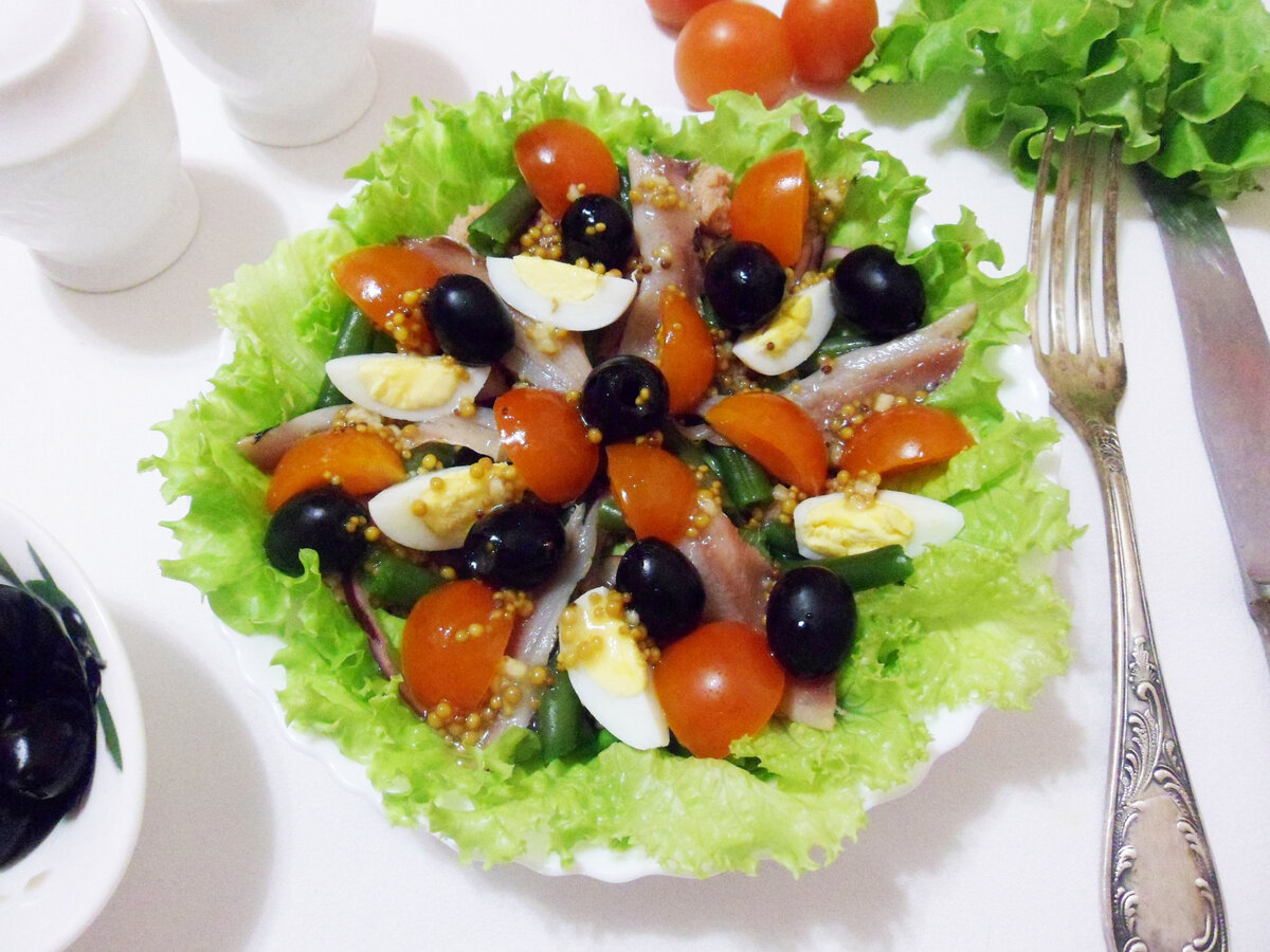 Салат Нисуаз с килькой пряного посола и необычной заправкой: полноценный ужин
