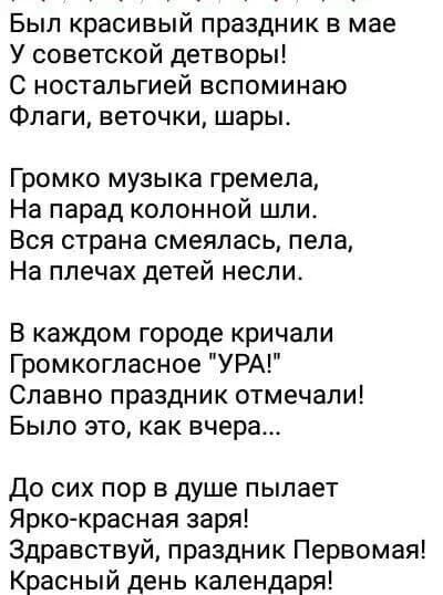 1 мая, курица хромая. Помните, друзья мои, как мы в детстве почему-то так говорили, типа дразнили праздник 1 мая. Почему, не знаю, праздник то был хороший: всё цветёт, расцветает, погода великолепная, нашей изнуряющей жары ещё нет и в каждом городе советской страны обязательно проходил торжественный парад. Это когда все организации города, школьники, студенты по всей стране выходили с транспарантами, плакатами, шарами, флагами, пели песни, кричали ураааа, патриотическая бодрая музыка по рупору звучала, объявлялись самые лучшие передовики производства, на трибунах с орденами, медалями стояли ветераны Великой Отечественной войны. Их тогда было много, наших родных, замечательных воинов, защитников Отечества, Родины. Вообщем всё ликовало, сверкало, и природа и люди и всё под девизом: Мир, Труд, Май. А как дети радовались, шагали с радостными мордашками с родителями, держа в руках яркие атрибуты праздника. Многим детям, кстати, именно к 1 мая покупали обновки, чтобы в праздничной ко