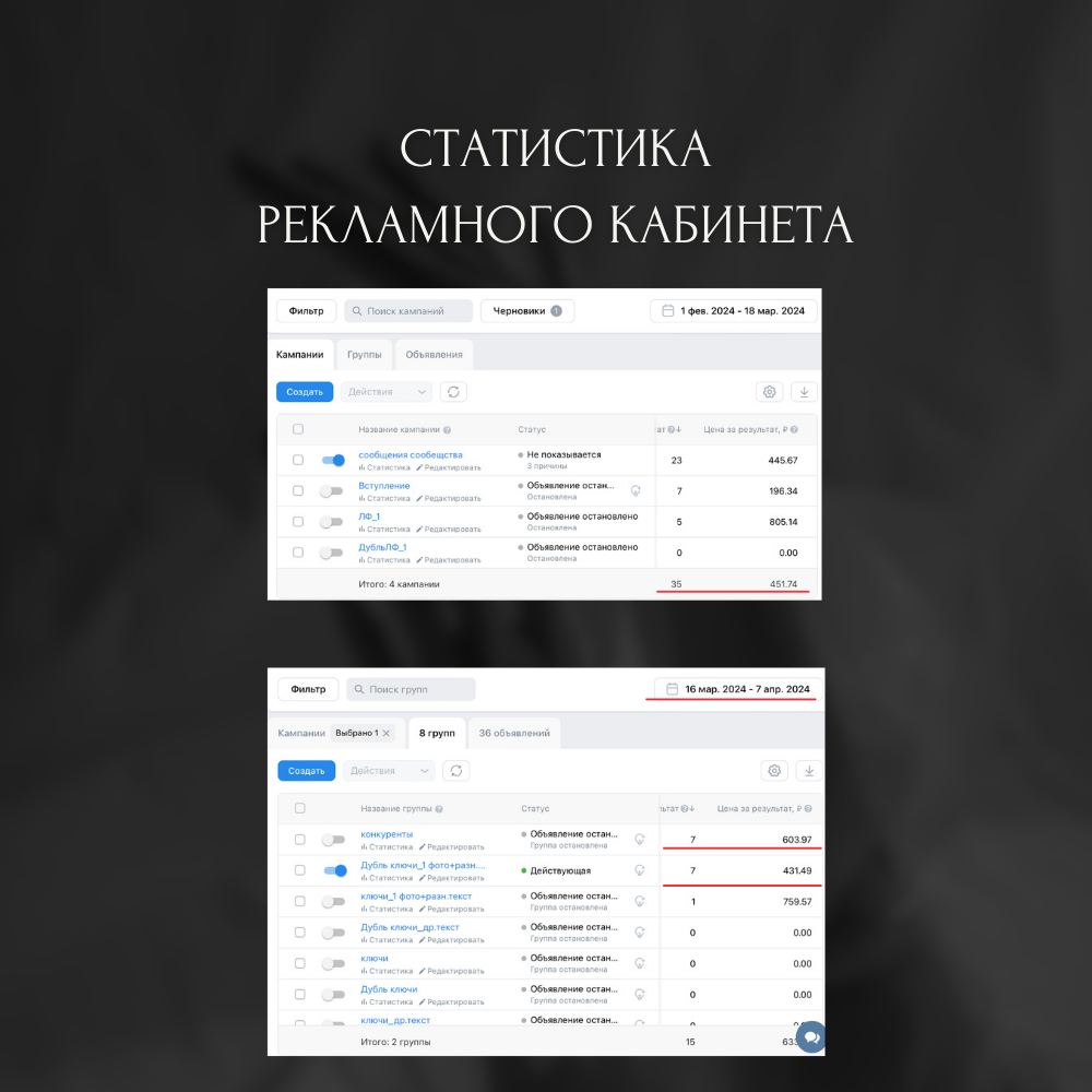 Изначально запускали рекламу в старом кабинете, но затем перешли в новый кабинет VK ADS. Так как стоимость заявки там меньше, а качество лучше. Оставить заявку на таргетированную рекламу можно: ВКонтакте https://vk.me/yourkseny.beauty Телеграм https://tlgg.ru/Yourkseny