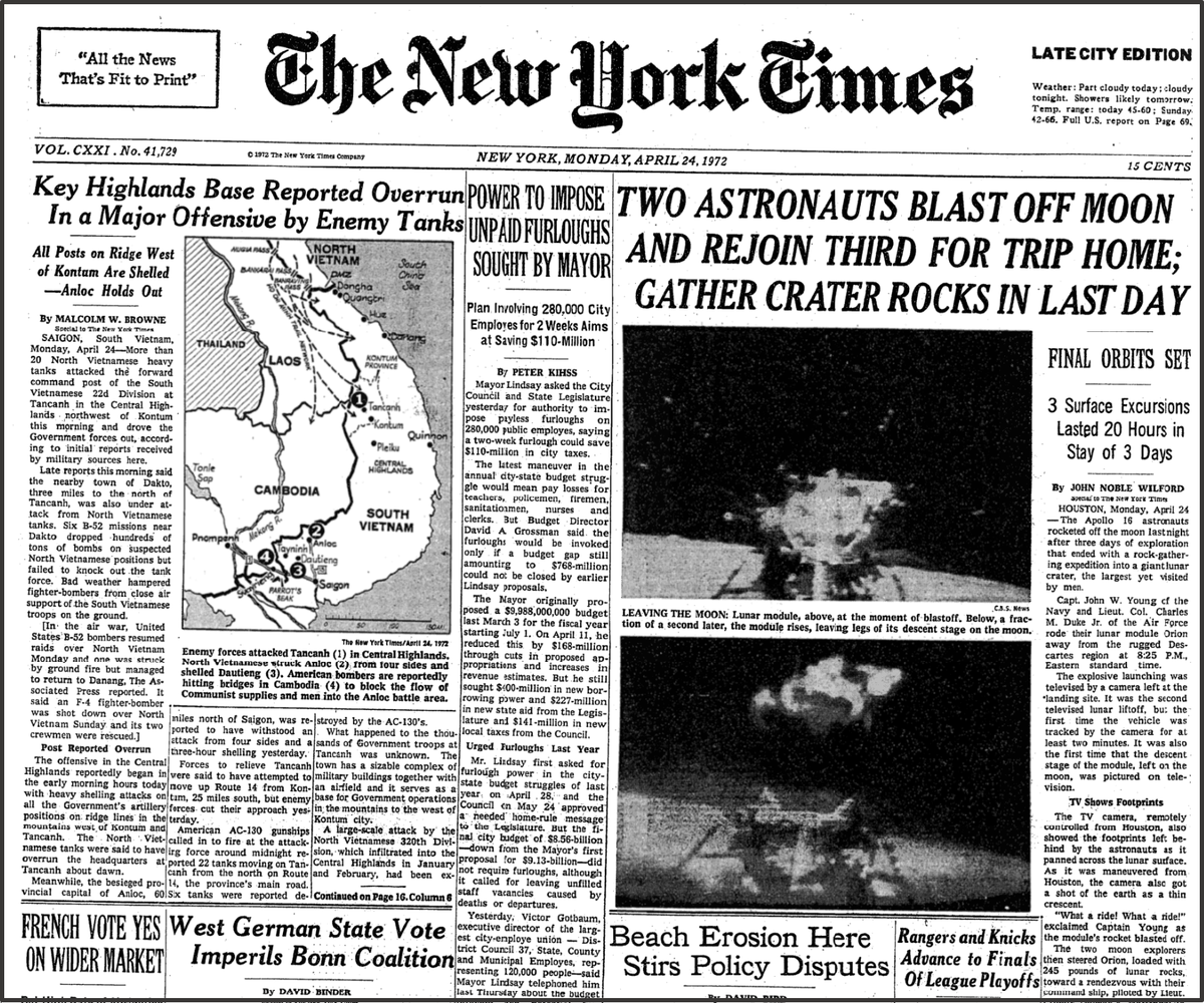 24 апреля 1972 года газеты сообщают о старте с Луны и размышления о исследовании загадочных пород. Три статьи из газетного номера от 24 апреля 1972 года. Всего в номере пять статей.