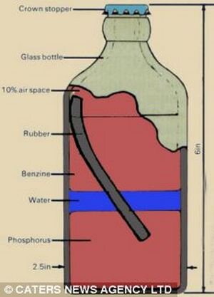 Тонкость момента заключалась в том, что в такой бутылке фосфор и бензин разделялись тонким слоем обычной воды. Но взбалтывать их химики не рекомендовали, поскольку иначе воспламенение происходило хуже.