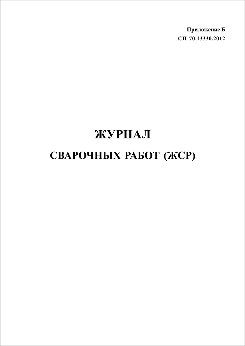 Нормативный документ: СП 70.13330.2012 НЕСУЩИЕ И ОГРАЖДАЮЩИЕ КОНСТРУКЦИИ, Приложение Б Титульный лист: Журнал сварочных работ № ___________ Наименование организации, выполняющей работы _______________________________ Наименование объекта строительства _____________________________________________ Должность, фамилия, инициалы и подпись лица, ответственного за сварочные работы и ведение журнала _______________________________________________________ Организация, разработавшая проектную документацию; чертежи КМ, КЖ, КМД, КЖД _______________________________________________________________________________ Шифр проекта _____________________________________________________________________ Организация, разработавшая проект производства сварочных работ ____________________________________________________________________________________ Шифр проекта _____________________________________________________________________ Предприятие, изготовившее стальные конструкции, арматурные и закладные изделия