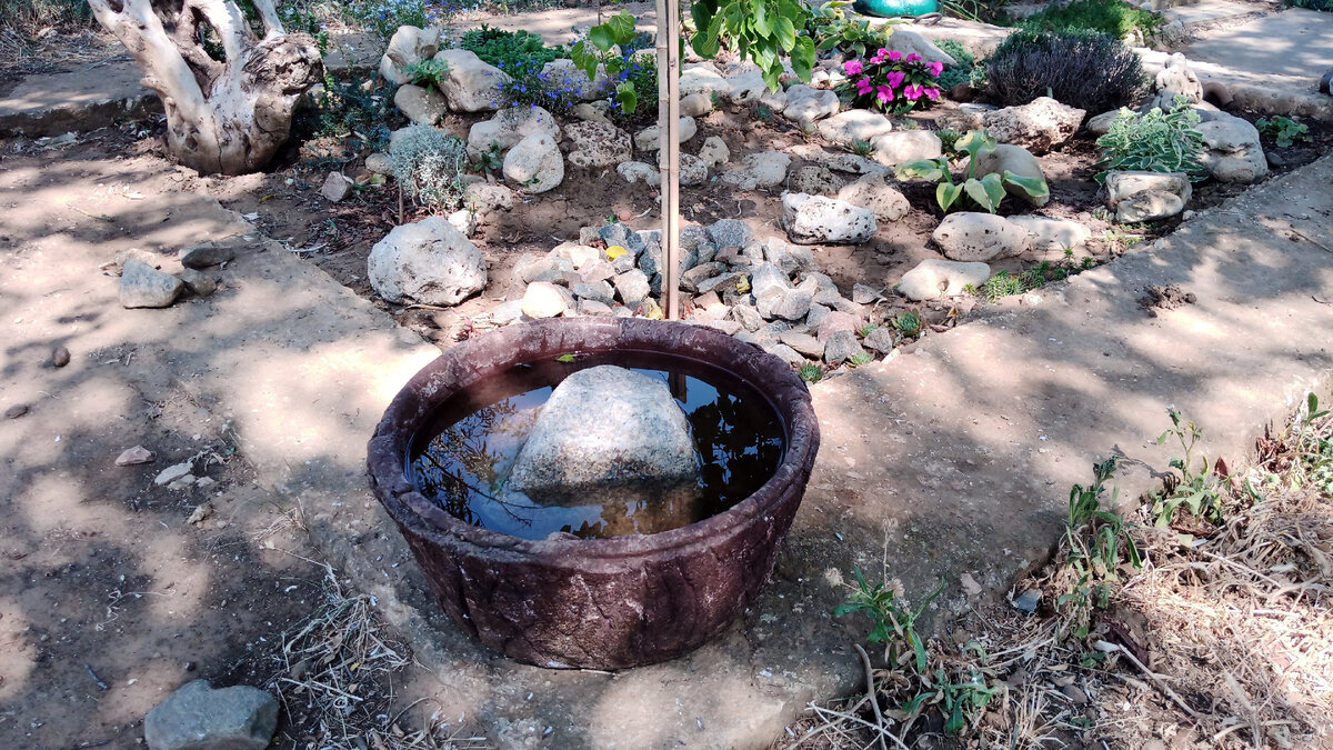 ... В конце прошлого лета рядом с клумбой появилось самодельное бетонное кашпо, подаренное соседкой. Всё лето оно служило поилкой для птиц, пока не дало течь.