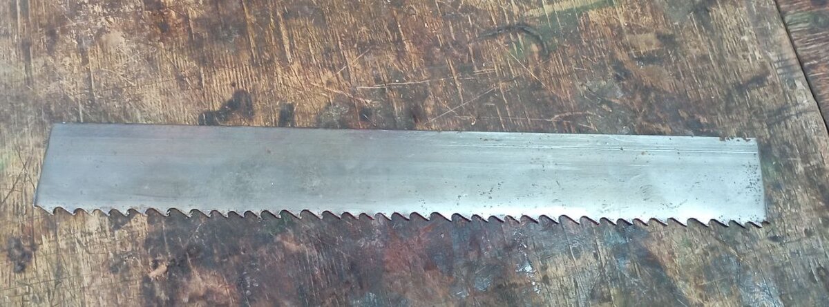 Всем привет! В этой статье я расскажу, как делал свой первый нож. У меня есть достаточно длинный кусок ленточной пилы (около трех метров), и я решил задействовать именно его. Сама пила была сделана из стали 45ХГНМФА, и судя по той информации, которую я нашел в интернете, она подходит для изготовления ножа. Повторюсь, это мой первый в жизни нож, который я делал своими руками, поэтому прошу строго не судить. А если среди читателей присутствуют опытные в этом деле люди, то поправьте меня, если я был не прав. Приступаем к процессу изготовления. 1. Материалы и инструменты. 1. Кусок ленточной пилы из стали 45ХГНМФА. 2. УШМ(болгарка). 3. Точильный станок(в принципе, болгарка способна его заменить, но с его помощью удобнее подравнивать кривые части после отпиливания). 4. Брус для ручки. 5. Эпоксидная смола. 6. Отрезной и лепестковый круги для болгарки. 7. Тиски и струбцина(ы). 8. Маркер. 9. Точильные камни. На этом список завершен, приступаем к следующему этапу - выпиливанию заготовки. 2. Выпи