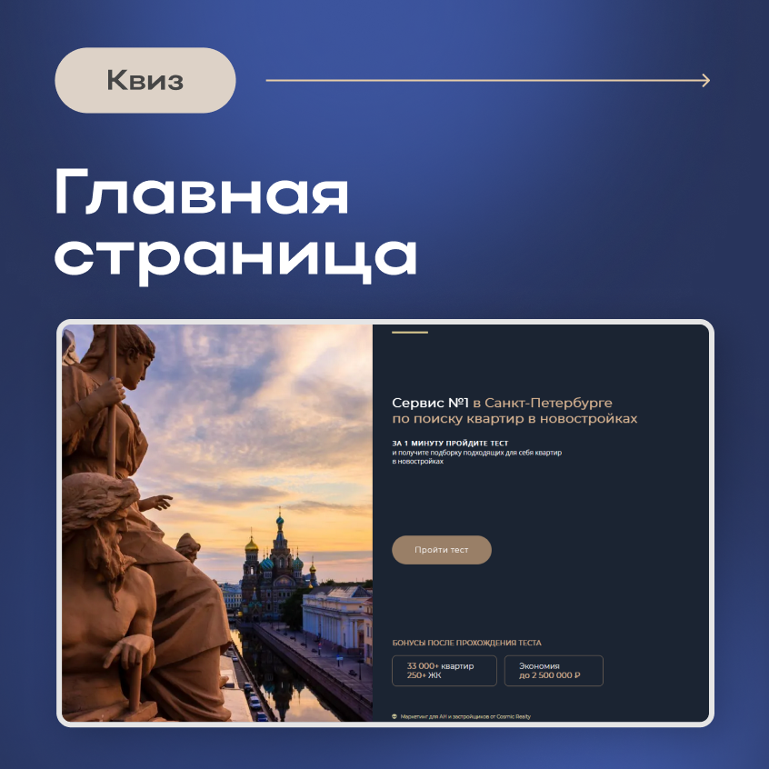 Квиз-лендинги — это мощный инструмент для получения недорогих и заинтересованных клиентов. Взаимодействие с сайтом в игровой форме повысит вовлечение потенциального покупателя. Как это работает? Обычно квиз представляет собой небольшой тест из нескольких уточняющих вопросов. По итогу прохождения клиент получит подборку объектов, каталог или другую информацию. В конце прохождения теста клиент заполняет форму заявки, в результате чего менеджер отдела продаж может связаться с лидом и отправить ему подборку или пригласить в офис для индивидуального подбора при личной встрече. Выглядит просто, но в этом деле есть много нюансов. Давайте рассмотрим несколько основных советов по созданию квиз-лендингов: • Не тратьте время клиента. Не нужно нагружать его лишним текстом — трёх-четырёх вопросов будет достаточно. Идеально, если на прохождение теста уйдёт не больше минуты. • Используйте реальные офферы. Чтобы лиды были тёплыми и лояльными, используйте действующие и актуальные предложения. Не стоит