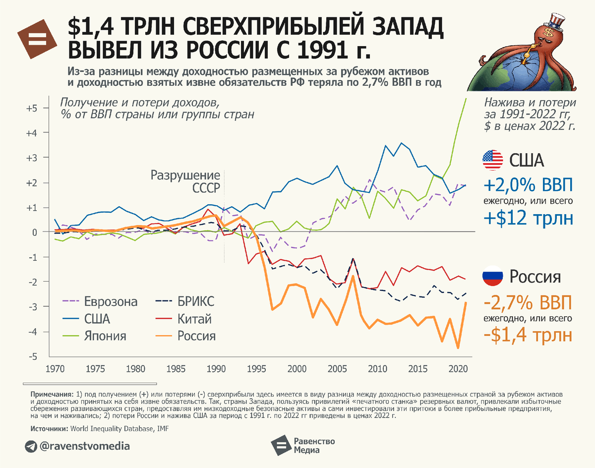 Из-за разницы между доходностью размещенных за рубежом активов и доходностью взятых извне обязательств постсоветская Россия теряла ежегодно по 2,7% ВВП, показало исследование Гастона Ньеваса и Элис Содано из Парижской школы экономики. Всего за 1991-2022 гг потери РФ превысили $1,4 трлн.