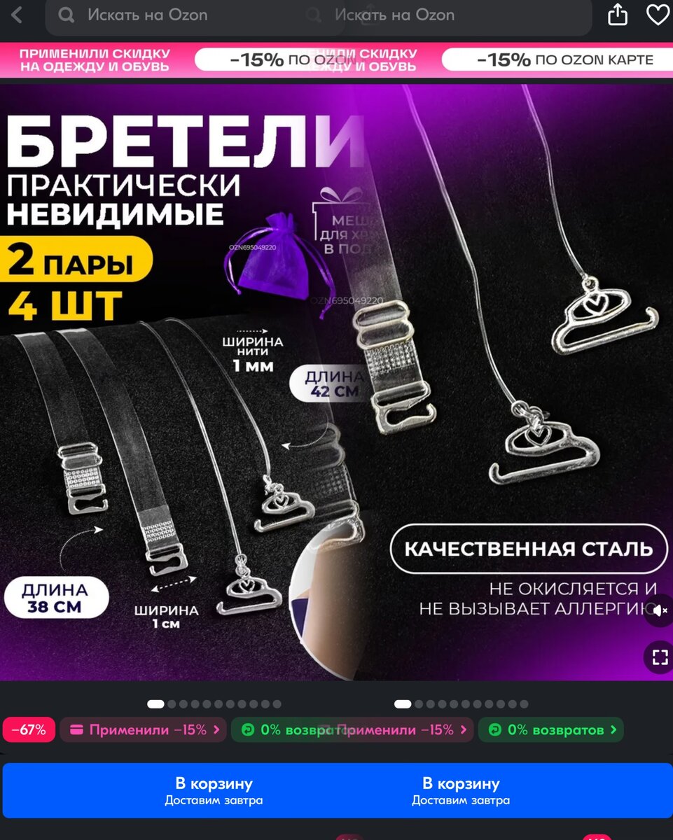 Друзья, привет всем! Очевидно, что при покупке чего-то нового, мы искренне радуемся и испытываем удовлетворение от приобретённых желаний. В каждом из нас живёт мечтатель, которому необходимо что-то новенькое и свежее в каждом дне: новый образ, популярный блеск для губ, невероятно красивый браслет, особенный держатель для телефона в автомобиль и даже новый обеденный стол. И маркетплейсы отлично справляются со своей задачей - закрывать потребности. В этой статье я поделюсь своими ВАУшными находками, которые отлично вписались в мою жизнь! БРЕТЕЛИ Ozon арт 695049220 Бретели выполнены из прозрачного силикона, прочные и невидимые. Предусмотрены два разных варианта, что очень приятно и совершенно не дорого. Настоящая находка для тех, кто любит носить вещи с открытыми плечами, но не решается носить их без бюстгальтера. ФУТЛЯР ДЛЯ ОЧКОВ Ozon арт 791408992 Прекрасный помощник в организации аксессуаров. Удобно и эстетично смотрится на полочке, а самое важное - занимает минимум простр