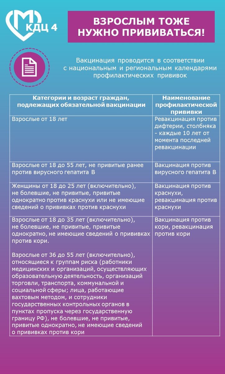 Кому делают прививки? Большинство из нас наверняка ответит, что детям. И действительно, большая часть профилактических прививок выполняется в возрасте до 18 лет. Но взрослые тоже нуждаются в защите и для них тоже очень важно вовремя вакцинироваться от опасных заболеваний. От каких и когда – в наших карточках.