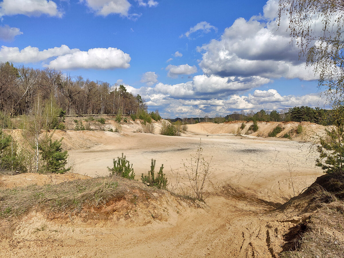 Думаю, очень многие помнят фильм Курьер и логово леопарда, куда Иван водил Марию. Снимали эту песчаную пустыню в Люберецких карьерах. Это то место, где мы бываем очень часто. Зимой катаемся на лыжной трассе Волкуша, а когда снега нет, гуляем по сосновым лесам. Сейчас весной, когда очень сыро, комфортно гулять можно только по песку, а значит, мы едем сюда. Можно просто пройти по лыжной трассе и намотать определенное количество километров, но интереснее зайти туда, где зимой не бывает лыжни. И нас ждут узкие дорожки, а потом, конечно, мы выходим на карьер, где живет леопард. Вернее, жил, поскольку при огромном скоплении тут мотоциклистов дикому зверю несладко. Катались они и в этот раз, но видимо, проснулись от зимней спячки еще не все, так что было вполне терпимо. Шашлычников тоже нет, поэтому воздух чист, и гулять приятно. И красиво. Кстати, многие дорожки перекопаны, вроде как делают освещение и всяческое благоустройство. И это хорошо.