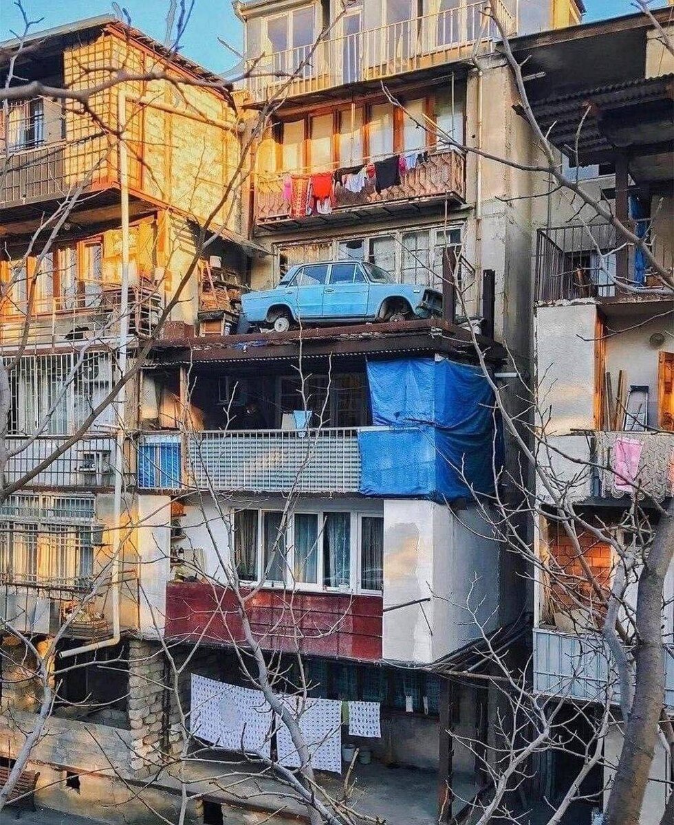 На балконе четвертого этажа обычной многоэтажки больше 20 лет стояли "Жигули"! Вы видели такое? У меня автомобиль в квартире ассоциируется только с мультфильмом "Простоквашино". Помните, там дядя Федор со своим папой прямо в комнате чинили свою машину - Запорожец. Но житель Тбилиси переплюнул даже этот смешной кадр из советского мультфильма. Дело было так. Вначале 90-х годов обычный тбилисец из самого обычного спального района города наконец исполнил свою давнюю мечту - купил новехонький автомобиль ВАЗ-2106. Но покататься на новой машине у него так и не получилось! Как и положено, свою радостную покупку на ночь он припарковал во дворе многоэтажки. Сигнализацию ещё не успел в нее воткнуть, поэтому решил ночью приглядывать самостоятельно за своей ласточкой. Но, увы охранник из него оказался не очень - в эту ночь с его автомобиля неизвестные сняли колеса и зеркала. Неудивительно, конечно - на дворе стояли веселые 90-е. Хозяин автомобиля так расстроился, что не придумал ничего лучшего и н