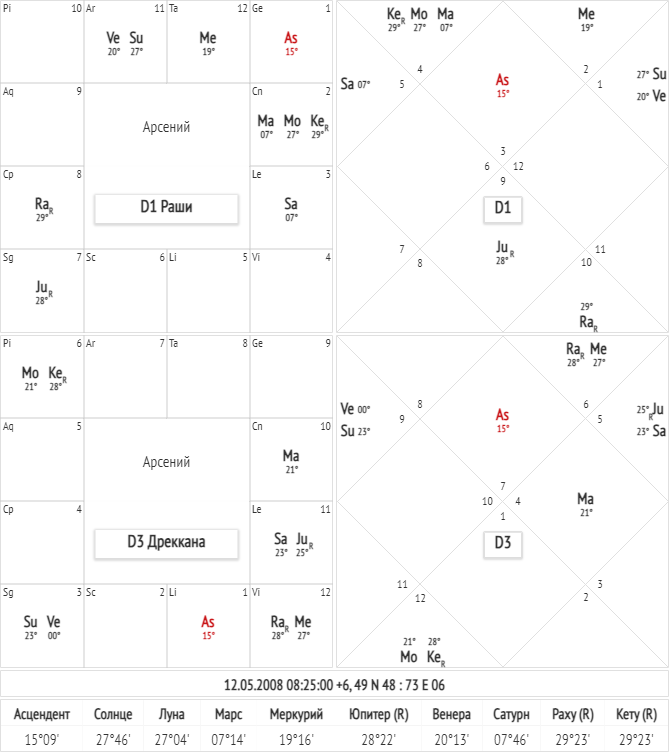 Интересно применение Дрекканы для уточнения характера человека, поскольку именно действуя, проявляя инициативу и взаимодействуя с окружающим миром мы демонстрируем свою природу. Дреккана имеет трёх управителей: Нарад, Агастья и Дурваса. В зависимости от того, в какой дреккане произошло рождение, будут проявлены качества одного из управителей. Но самое информативное начинается, когда мы делим каждую дреккану ещё на три части и получаем 1/9, то есть Навамшу. Каждая часть соответствует гуне Дева, Нара и Ракшас, то есть имеет норадреналиновую, серотониновую и дофаминовую природу. Об этом я писала здесь https://dzen.ru/a/ZeP7u3dQslpkgfhg?share_to=link Рассмотрим вышесказанное на примере гороскопа подростка, с которым я работаю. Какова будет его природа и характер? Последовательно определим управителя и гуну для каждой грахи и лагны. Например, в D3 восходит 2 дреккана - управитель Агастья, лагна дрекканы попадает во вторую гуну (10-20°С), это Нара или Манушья, соответствующая серотониновой г