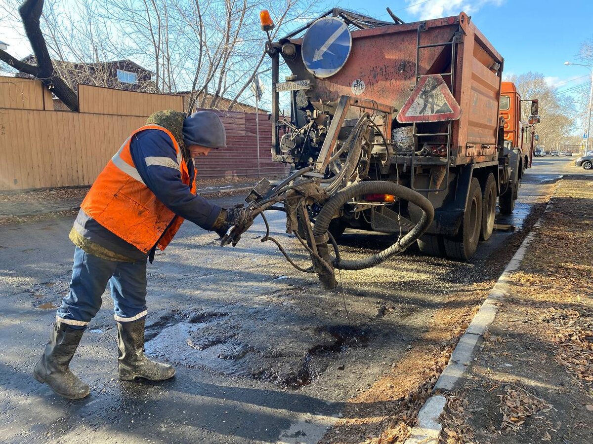 Сейчас в ремонтных работах задействованы три человека. Это водитель спецтранспорта, оператор машины для ямочного ремонта, который заливает эмульсией и щебнем выбоины, а также специалист, который подготавливает трещины и ямки к ремонту.
